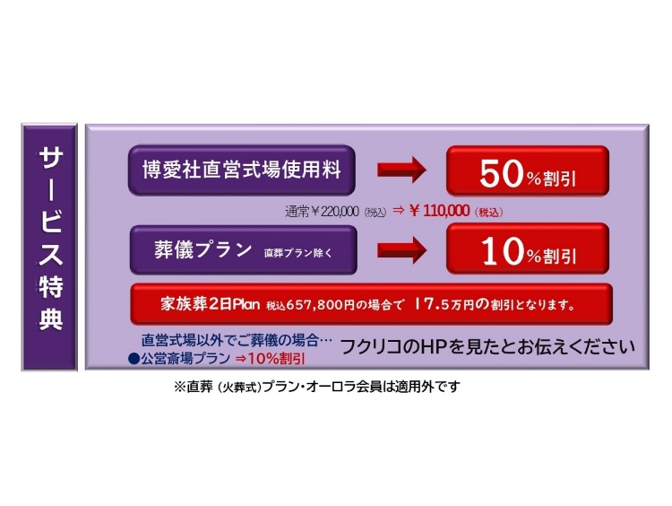 2日葬プランご利用で最大17.5万円の割引となります。
