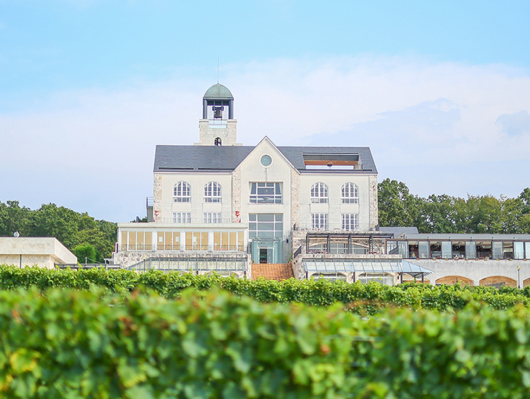 広大なぶどう畑が広がる丘の上のワイナリー